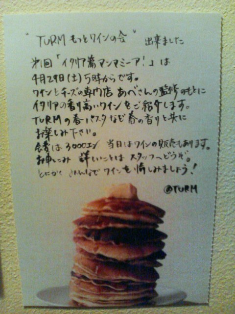 マンマミーア!! TURMでワイン会を開催いたします☆ 今回のテーマはイタリアワイン!! 気軽なワインを中心に。チーズ&ワインabeの阿部店長がセレクトしてくれたワインさん達です〜☆ TURMの料理とどんなコラボを見せるのでしょう 楽しみですね〜 参加費は、3000円位になるらしいです。。お買い得! 皆様の参加!!心よりお待ちしておりますよ〜!! 美味しいワインと楽しい会話。そして、TURMの持つ空間をそれぞれのスタイルで...