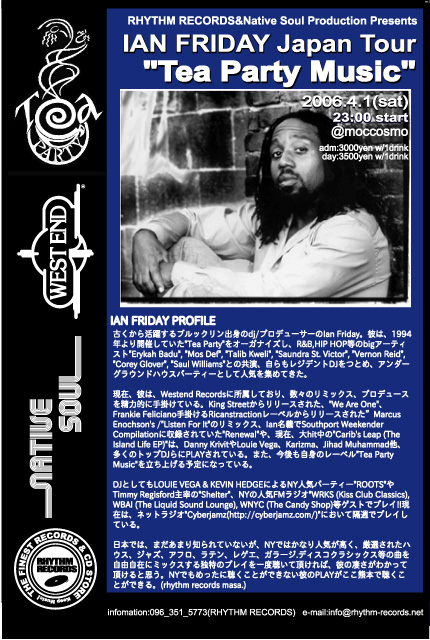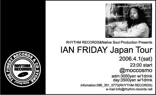 現在彼はNEWYORKでも話題のDJであり、数々の楽曲をリリース、またREMIXでも多くの曲に参加し、どれも話題の曲となっています。そんな彼が、今回NATIVE SOUL PRODUCTIONのサポートを得、JAPAN TOURを開催することとなりました。今回、そのIANを招聘するのは全国でも熊本と群馬2箇所のみとなっています。熊本でも西日本一帯からの来場者が見込まれます。お早目の前売り券購入をオススメ致します。