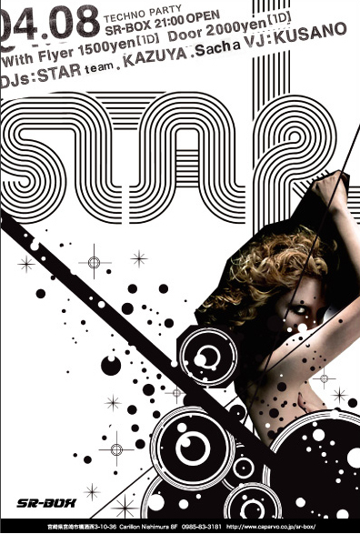 TechnoParty STAR @SR-BOX DJs: STAR TEAM sacha KAZUYA VJ: KUSANO 2006 4/8 (sat) with Flyer 1500yen 1drink door 2000yen 1drink