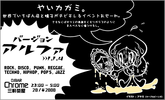 3年目に突入することになる[ver.α]。 4月は新たな出発の季節ということで心機一転、 開催場所が変わりますー! 1年目は流浪の民状態。 2年目は幡ヶ谷に腰を落ち着け、 3年目は・・・どうなるんだろう。 花見のシーズンではありますが、 三軒茶屋で音桜にまみれながら一緒の時間を過ごせればと。 スピリタスも通常量より多めの入荷をお願いしておきまーす。 ※お知らせ※ 【ver.α】では現在、絵描きさん・WEBデザイナー・当日 お手伝いをしてくれるサポートスタッフさんを募集中です。 興味のある方はスタッフまでご連絡ください