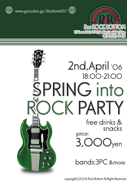 『SPRING into ROCK PARTY』 ●日時 : 2006/04/02(日) ●場所 : ROCK BOTTOM ●時間 : 18:00〜21:00(開店:17:30) ●値段 : ¥3,000(飲み放題、バイキングスナックつき)※税込 ●バンド : 3PC、その他 ●お問合せ : 03-3625-9491(担当:オサダ) ロックボトムの2006年第一弾パーティは音楽色の強いライブスタイルパーティ! 80’s、90’sをメインとしたライブステージ+飲み放題で、新年度のスタートを飾りましょう! 尚、誠に勝手ながら当日はシートなしの全席オール