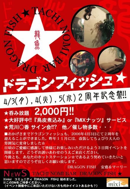 毎度ありがとうございますっ おかげさまで、DRAGON FISHも2006年4月3日で2周年を迎えます!!! 日頃の皆様の温かい声援に感謝をこめて 4/3(月)4/4(火)4/5(水) 3日間、 2000円 呑み放題日★ とさせていただきます。 さらに・・ 大好評中の『鳥皮煮込みゆず風味』もしくは『MIXナッツ』 のどちらか1品をさしあげちゃいます☆ 常連さんも最近いらした方もご無沙汰な方も初めての方もそのまたお友達も み〜んなまとめてお待ちしております♪♪♪ 今後とも、あなたのホットステーションで