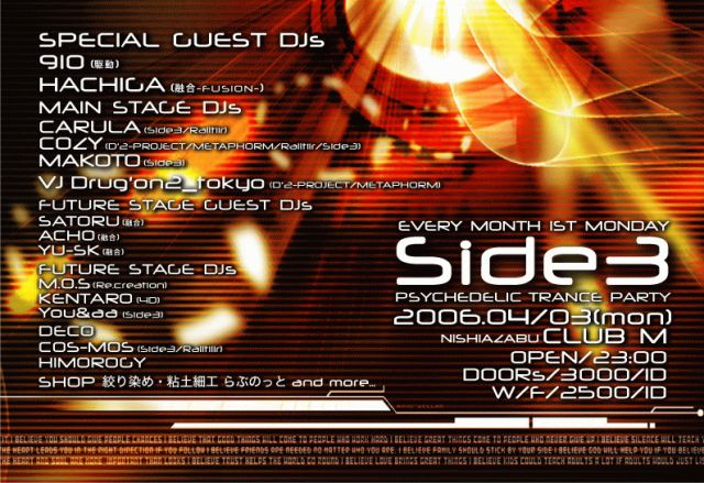 ∈Side3∋ Feat. 融合&駆動 @Club M(西麻布) 2006.04.03(MON) OPEN/START 23:00 ■FEE Doors/3,000(1d) Web discount/2,500(1d) E-mail discount/1,500 ■GUEST DJs 910(駆動) HACHIGA(融合) ■MAIN STAGE DJs CARULA (Side3/Ralltiir) COZY (D'2-project/METAPHORM/Ralltiir/Side3) MAKOTO (Side3) ■MAIN STAGE VJ Drug'on2_tokyo(D'2-project/METAPHORM) ■FUTURE STAGE GUEST DJs SATORU (融合) ACHO (融合) YU-SK (融合) ■FUTURE STAGE DJs M.O.S(Re.creation) KENTARO(4D) You&aa (Side3) ■D