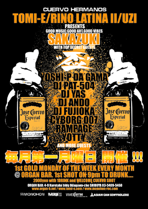 はい、あれから1ヶ月...とうとう1ヶ月です!!! クエルボ・ヘルマノス(TOMI-E/RINO LATINA II/UZI)が毎月第1月曜日に渋谷オルガンバーでお送りするイベント"SAKAZUKI" なんと今回で8回目!!!!!!! (」゚ロ゚)」(」゚ロ゚)」(」゚ロ゚)」オオオオオッッッ 毎週月曜日の名立たるイベントの中でもとうとう集客率NO.1にーーーーー!!!!! (」゚ロ゚)」(」゚ロ゚)」(」゚ロ゚)」オオオオオッッッ あの親密感漂うオルガンのハコになんと100人の人がクエルボ漬けとなっております♪ さぁ〜!!!そこのまだ来たことのない方!!! ぜひ、足を運んで一緒にテキ