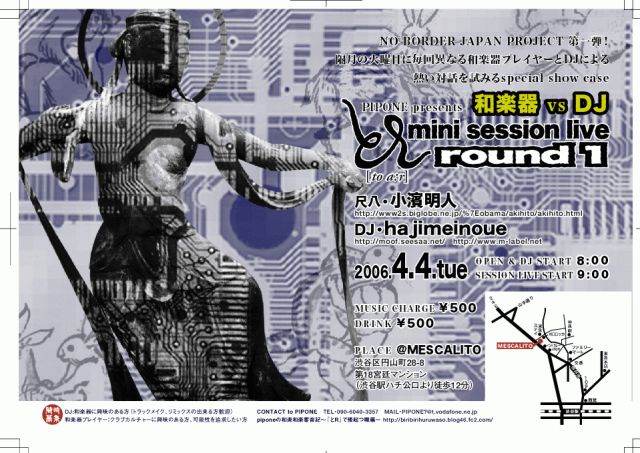 このコミュのコンセプトど真ん中なイベントです。和楽器とDJのセッション第一弾をやります。 期せずして春に始まります。 隔月ペースで続けてまいります。 ◆一回目は和楽器は尺八☆小濱明人 ※http://www2s.biglobe.ne.jp/%7Eobama/akihito/akihito.html DJはhajimeinoue(元ピコシステム) ※http://mixi.jp/show_friend.pl?id=310356(aoof) http://moof.seesaa.net/ サウンドブログ http://hajimeinoue.net ホームページ ◆OPEN&DJSTART>>20:00 SESSIONSTART>>21:00(小1時間)
