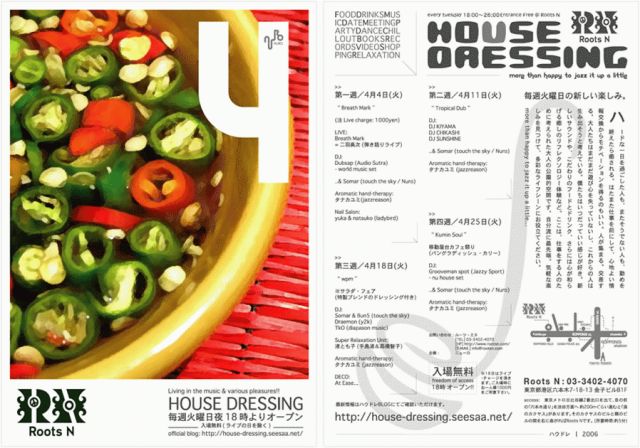 毎週火曜日の新しい楽しみ。大都会の真ん中に大人のための公園ができます☆平日らしい気軽な楽しみを見つけて、多彩なライフシーンにお役立てください。 http://house-dressing.seesaa.net/ (詳細はコチラで♪) オープニングのスペシャルとして、 BREATH MARK=二羽高次 弾き語りライブ! を予定しています。是非。 皆様のお越しを心よりお待ち申し上げます。 2006.04.04 (tue) @ 六本木Roots N open: 18:00 charge: 1000yen LIVE: Breath Mark = 二羽高次 (弾き語りライブ) DJ: Dubsap (Audio Sutra) - world mu
