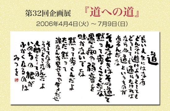 会期:2006年4月4日(火)〜7月9日(日) 月曜休館(祝・祭日の場合は開館) ※4月29日(土)〜5月7日(日)は休まず開館 相田みつを美術館 〒100-0005 東京都千代田区丸の内3-5-1 東京国際フォーラムガラス棟 03-6212-3200(代表) 03-6212-3202(24Hテレフォンガイド) 10:00〜17:30(入館は17:00まで) 誰の人生にもどうにもならない苦しい時期があります。相田みつをにとって、50才前後のある時期がその一つでした。書家・詩人として長く活動を続けてはいても、いまだ世には知られず、生活面でのひっぱく逼迫や
