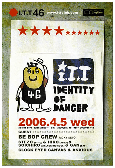 I.T.T 46 2006.4.5 (WED) at club core open 22:00 adv 2500yen / 1d door 3000yen / 1d GUEST : BE BOP CREW (RICKY SETO) STEZO (STO) + HIRO (ALMA) + SOICHIRO + GAN (SAS) CLOCK EYED CANVAS & ANXIOUS DJ : 瀧澤賢太郎 (impressive time) Nice & Suthoom (SYMBOL-ISM) CDJ KEN (monograph) SHIBAKI (buki) 今回46回目のI.T.Tはある意味意外な!?ゲスト陣。 普段とはとは少し違ったI.T.Tが期待できる一日になりそうです。 皆さん、お楽しみに。 出演者募集してるので気軽にメッセージくださ