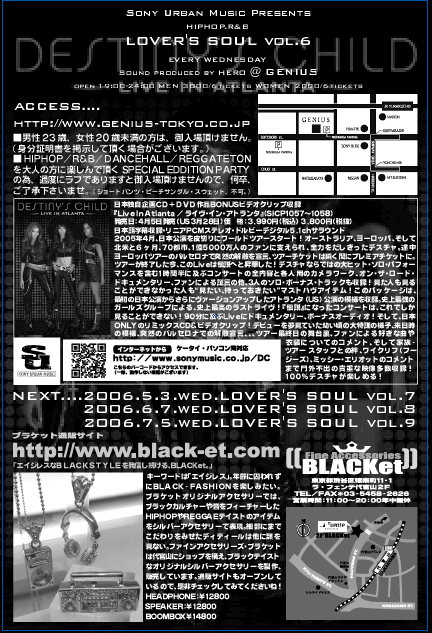 開催日時: 2006年4月5日 (水曜日) 開催場所: 東京都 (@目黒食堂) 80年代のHIT & 80年代後半〜90年代前半の『New Jack Swing』を中心にお届けします♪ エントランスフリー、ドリンクメニュー全品半額の目黒食堂感謝祭。 皆様、お待ちしております♪ DJ CASH / DJ WAKA / DJ TARABOW DOOR OPEN 10PM 毎月第1水曜日開催中〜