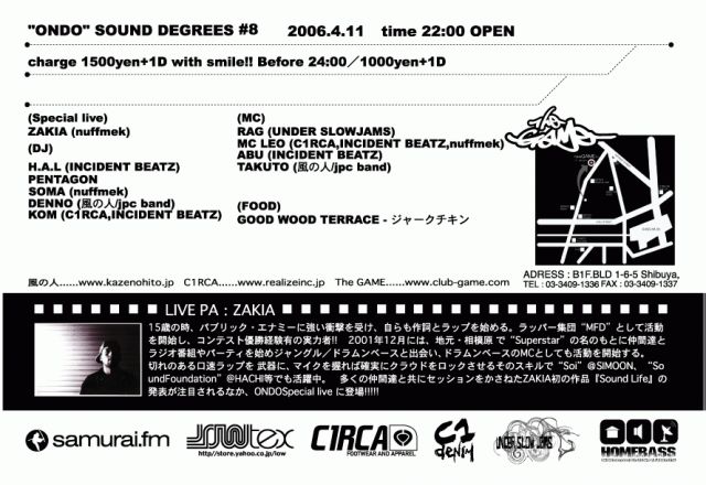桜前線と共にONDOも満開!! 前回から始まったSpesial Live第二弾!!!その名ZAKIA。 HIP HIPをバックボーンに様々なワードを繰り出す 口速男が魅せるステージは必見。 多くのアーティスト達とのセッションにより完成間近なZAKIA 初の作品「SOUND LIFE」のなかからブランニューもお届けする。 5DJ's+5MC's!!それぞれのoriginal音源やLIVEを発信する中、 日本初のジャパニーズD'nBアーティストによる コンピレーションアルバムにもONDO Crewの中から多数参加!!! 桜も散らす重低音な一夜冬眠から目覚めよ!!! "ONDO" SOUND DEG