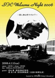 <実施概要> 名称:SFC Welcome Night 2006 -探し物は何ですか?- 日時:4月11日(火)、18:3020:30 場所:SUBWAY(立食パーティー形式) 食事:SUBWAYパーティーメニュー・飲み放題(アルコールは出ません) 費用:500円 定員:約60名 <参加登録> 本イベントは定員60名程度を予定しております。 参加を希望される方はお早めに登録をお済ませ下さい。 宛先:welpa2006@sfceed.jp 件名に「ウェルパ参加登録」 本文に以下の内容をお書き下さい。 ・学部 ・お名前 ・携帯電話の番号 ・携帯電話のメールアドレス ・当日、聞い
