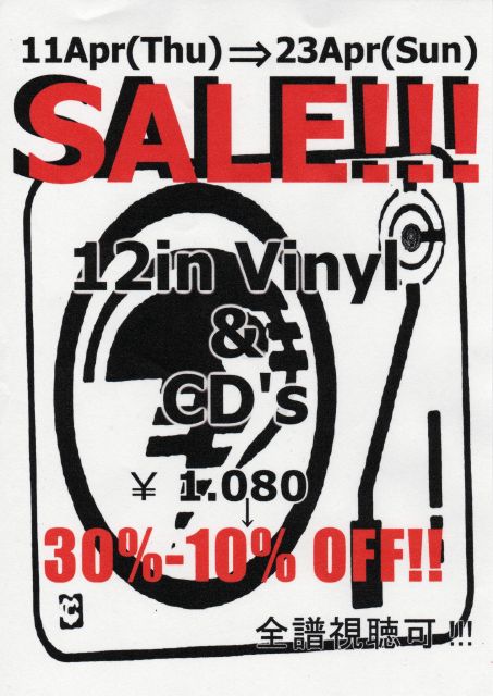 横浜 元町のテクノレコード店 Dbc17と申します 12in&CDセールの告知させてください ******レコード&CD 30%〜10%OFF****** 4月11日(火曜日)〜4月23日(日曜日)の2週間 在庫入れ替えの為 セールを実施します ★★★★★★ 全譜視聴可能!!!★★★★★★★★ 30%OFF(¥1.080⇒¥760) ↓ トランス {PurpleEye/Bonzai/Tsunami/Carnal/Blackhole/Multitracks..} ドラムンベース {Full Cycle/FREQUENCY/FABRIC/DSC14/RUFFTECK/RONI SIZE..} 20%OFF(¥1.0