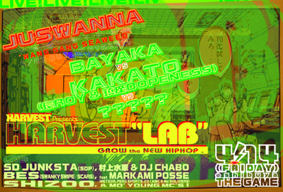*!HYBRID HIPHOP PARTY!* <HIPHOP,REGGAE,DUB,ROCK,R&B,D'n B,JUNGLE,TECHNO,HOUSE,SOUL,GARAGE,CLASSIC,etc> LADYs FREE! 4/14(FRI) HARVEST presents HARVEST"LAB" vol.2 *only w/f LADYs -24:00 FREE 24:00- 1000YEN ------------------------------------------------- 一番REALで理想的な遊び。 誰が一番高く迄行けるか? 思いきり遊ぶ音と言葉で飛ぶ! お前がやんなきゃ誰がやるんだ? そんなPARTY! ------------------------------------------------- SPECIAL LIVE: JUSWANNA(LIBRA) 遂に!4