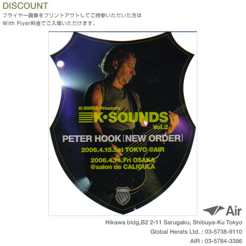 "K-SOUNDS"第二弾は、前週KARL BARTOS ex-KRAFTWERKに続き、ついにこの日待望のアーティストがAIRに登場する。PETER HOOK/ NEW ORDER。NEW ORDER のベーシストとして輝かしいキャリアを持つ彼が、なんとDJとしてこのイベントに参加する