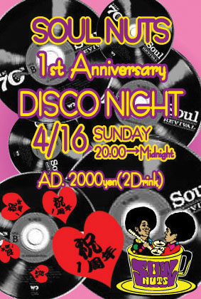 今度の4月でSOUL NUTSもようやく1周年です。 何とか1年やってこれました(^^;) 日ごろの「躍らせて!!」の声に応え、 この日ばかりはディスコパーティーしちゃいます。 PM8時〜私が正気でいられるまで(笑)。 DJは、盛り沢山!! NICKさんはじめ、Miracleの川畑さんや、Soul Serchin'の吉岡さん、オッシーさんなどなど、豪華メンバーでお届けすることとなります。 と言うか、当日になって急に他のゲストが色々入るかも(^^;) 結構いい加減です、私(^^;) 料金は2000円(2Drink)です。 追加ドリンク・フードはすべて500円。 年に1度ぐらい、みんなで