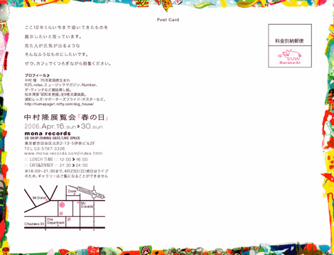 会期。4月16日(日)から30日(日)まで (時間帯が結構微妙です。お昼の12時から4時までと、 夜の9時から深夜0時までのカフェタイムにご覧になれます。 その間の時間はライブタイムのため、ご覧になれません。 あと23日(日)は一日ライブがあるかもしれないので、 見れないかも?!ということです) ハ 場所。下北沢mona recordsにて mona records 〒155-0031 東京都世田谷区北沢2-13-5 伊奈ビル2F TEL: 03-5787-3326 FAX: 03-5787-3327 http://www.mona-records.com/ info@mona-records.com 営業時間