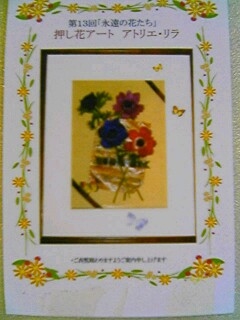 毎回好評の、生徒さんたちと一緒の押し花作品展です。いつも秋に開催していたのですが、去年は会場が取れなくて今年の春になってしまいました。 春爛漫の押し花の作品をどうぞご覧になってくださいね! 入場無料ですので春の砧公園を散策された後にでもどうぞ。 私は毎日詰めていますので、mixiの方どうぞお声掛けて下さいね!
