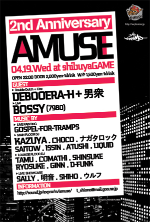 AMUSE VOL.24 2nd Anniversary OPEN 22:00¡Á DOOR 2000±ß/1D,WF 1500/1D GUEST LIVE¡§ SISTER KAYA ¡¡¡¡ DEBOOERA-H+Ã˽° ¡¡¡¡ BOSSY LIVE PEINTING:GOSPEL FOR TRAMPS MAIN FLOOR DJ: KAZUYA,CHOCO,¥Ê¥¬¥¿¥í¥Ã¥¯,SAITOW, ISSIN,ATUSHI,LIQUID LOUNGE FLOOR DJ: TAMU,COMATHI,SHINSUKE,RYOSUKE, GINN,D-FUNK LIVE:SALLY,ÌÀ²»,SHIHO,¥¦¥ë¥Õ DANCE:SHOELACE µ¤¤¬¤Ä¤±¤Ð2¼þǯ¡ª¡ª¡ª ´¶¼Õ´¶¼Õ¤Î2¼þǯ¡ª¡ª¡ª ³Ú¤·¤ß¤Þ¤·¤ç¤¦¡£