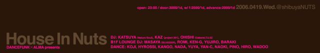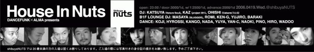 ï¤â¤¬Ç§¤á¤ë¥Ï¥¦¥¹³¦¤Î£Ô£Ï£Ð¥Á¡¼¥à¡Ö£Á£Ì£Í£Á¡×¤ÈËè½µ¿åÍËshibuyaNUTS¤Ë¤Æ³«ºÅ¤µ¤ì¤Æ¤¤¤ë¥À¥ó¥¹¥¤¥Ù¥ó¥È¤ÎÀ©ºî¥Á¡¼¥à¡ÖDANCEFUNK¡×¤¬£´·î£±£¹Æü¤Ä¤¤¤Ë¥³¥é¥Ü¥ì¡¼¥·¥ç¥ó¡ª¡ª ¥·¥ç¥¦¥¿¥¤¥à¤Ë¤â¥¯¥é¥Ö¥¿¥¤¥à¤Ë¤â¤È¤³¤È¤ó¤³¤À¤ï¤Ã¤¿¤ªÞ¯Íî¤ÇÍÙ¤ì¤ë¥¤¥Ù¥ó¥È¤ò³«ºÅ ¥á¥¤¥ó¥Õ¥í¥¢¤Ï¡ÈHOUSE MUSIC floor¡É¡¢B2F LOUNGE ¡ÖMubell¡×¤Ï¡ÈDANCE CLASSIC floor¡É¤È¤¤¤¦¤É¤Á¤é¤Î¥Õ¥í¥¢¤Ç¤â³Ú¤·¤á¤ë¹½À®¤Ë¤Ê¤Ã¤Æ¤¤¤Æ¡¢¥À¥ó¥¹¹¥¤¡¦²»¹¥¤¤Ë¤Ï¤¿¤Þ¤é¤Ê¤¤°ìÌë¤Ë¤Ê¤ë¤³¤È´Ö°ã¤¤¤Ê¤·¡ª¡ª £²£°£°£¶¡¢£´·î£±£¹Æü¡Ê¿å¡Ë DANCEFUNK¡ßALMA presents ¡ÖHOUS