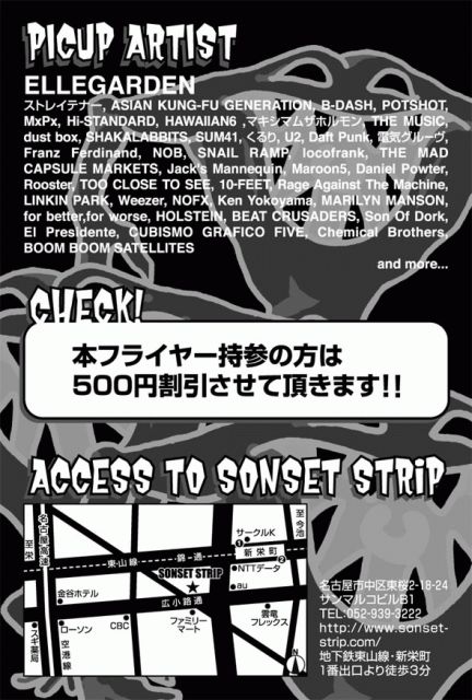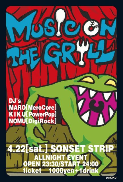 毎度、不肖の管理人まろですこんにちわ おかげさまでコミュ参加者が100人を超え嬉しい限りです せっかくこうやって同じ物を好きな人がたくさん集まってくれてるので 皆仲良くしませんか?と もっと音楽の繋がりや人脈をお互いに増やしてみませんか?と オールナイトイベントやります 【イベントタイトル】 MUSIC ON THE GRILL 【日程】4/22(土) 【場所】新栄SONSET STRIP (詳細:http://www.sonset-strip.com/top.html) 【時間】OPEN 23:30 START 24:00 【入場】\1000(ドリンク別) ※フライヤー持参