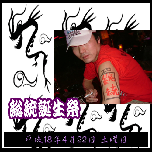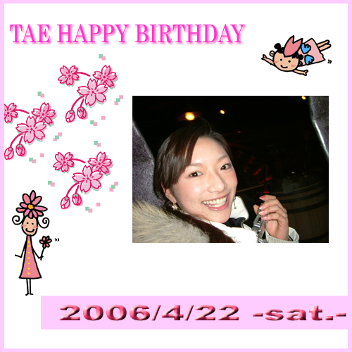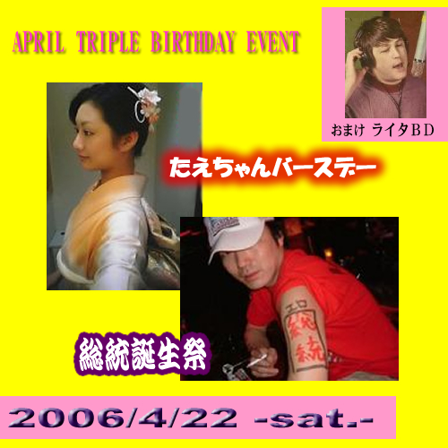 みなさん、ドモデス! 来る、4月22日土曜日に我らがアイドル「たえちゃん」の誕生パーティー、そして偉大なる「ツヨシ総統閣下」の誕生祭をDにて開催します! そして私ことながら、便乗にてライタBDも祝っていただければ、これ幸いです。 当日は、D恒例の「シャンパン狂の詩」を各方面より大期待。R−兵はじめスタッフ一同、盛り上げ必死の覚悟です。 DJは今回は皇子、RYOTAとがフル稼働にて、R&B,HIP-HOP中心で盛り上げます。 そして、今回もめだりすとじゃぱん所属AAフライトプレイヤー活躍なるか? みなさん、参加お待ち