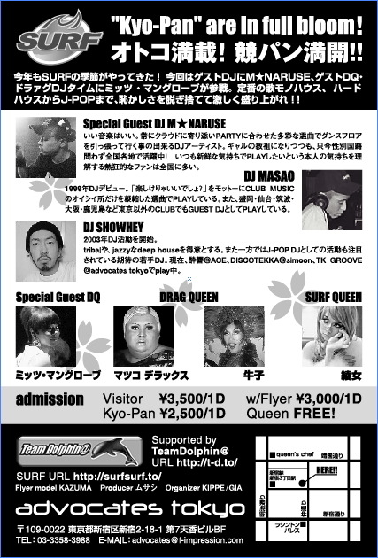 今回はゲストDJにM★NARUSE、ゲストDQ・ドラァグDJタイムにミッツ・マングローブが参戦。定番の歌モノハウス、ハードハウスからJ-POPまで、恥かしさを脱ぎ捨てて激しく盛り上がれ!!