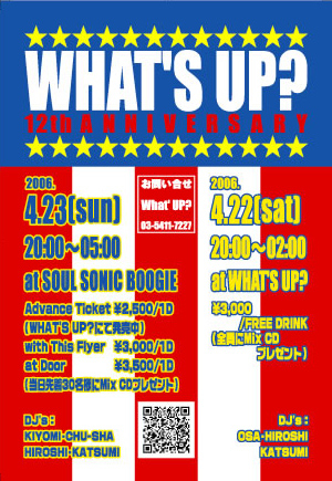 2006/04/23 WHAT'S UP? 12th ANNIVERSARY 2 http://mixi.jp/view_event.pl?id=4754230&comm_id=255384 ▽4/23日 20:00〜5:00 ▽DJ's: ・Chu-Sha http://mixi.jp/show_friend.pl?id=2272028 ・KIYOMI http://www.spy-lo.net/kiyomi/ ・HIROSHI http://mixi.jp/show_friend.pl?id=456318 ・KATSUMI http://mixi.jp/show_friend.pl?id=1218158 ▼料金: ・前売\2,500 (2/25より発売開始) ・当日\3,500 共に1ドリンク付き ※(フライヤー&携帯サイト http://www.spy-lo.net/whatsup/ で\500 OFF WHAT'S UP?の今年