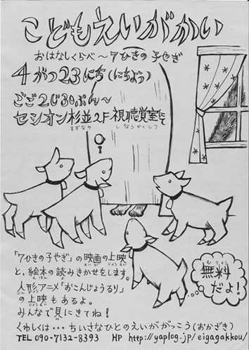 今回も「おはなしくらべ」と題して、同じ原作をもとにしたアニメ映画化された作品を上映します。第2回はグリム童話の名作「7ひきの子やぎ」のアニメを2本上映します。 また、上映の前には原作絵本も朗読します。絵本と映画から受ける印象の違いや、同じお話でありながらキャラクターやストーリーに若干の違いがみえる2つの映画をくらべてみることで、もっと映画を観る楽しみを知ってもらいます。 また「おはなしくらべ」の前には、岡本忠成の名作人形アニメ「おこんじょうるり」も上映します。 子どもはもちろん、親にとっても楽しめるプログラム