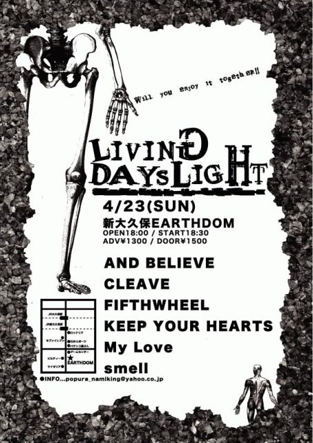 すみません、告知失礼致します。 4/23(日) 新大久保EARTHDOM 『LIVING DAYSLIGHT vol.1』 ■AND BELIEVE ■CLEAVE ■FIFTHWHEEL ■KEEP YOUR HEARTS ■My Love ■smell open 18:00/start 18:30 adv\1300/door\1500 新大久保EARTHDOM↓ 新宿区大久保2-32-3リスボンビルB1 http://www1.odn.ne.jp/shinjuku-dom/index.html/dom.html とんでもないメンツになりました。 是非遊びにいらしてください。 ticket info popura_namiking@yahoo.co.jp 各バンドさん、もしくはここにメッセージください。