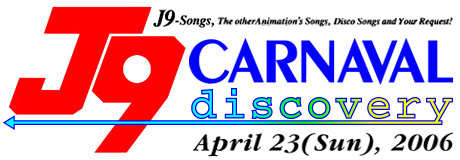 オールジャンル・コスプレダンパ 「J9カルナバル ディスカバリー」 J9って知ってるかい?知ってる人も知らない人も、 J9-Songsで踊ろう!! 銀河旋風ブライガー/銀河烈風 バクシンガー/銀河疾風サスライガー...J9シリーズ 全作品・全27曲フルカバー...その上、 他、オールジャンルアニソン、洋楽・邦楽ヒットチャート、 '80sディスコヒット etc. 何でもアリ、ぶっ通し踊りっぱなしの3時間!! ・・・・・・・・・・・・・・・・・・・・・・・・ 日時 2006年4月23日(日) 16:00〜19:00(貸切) ※入場受付:15:20〜