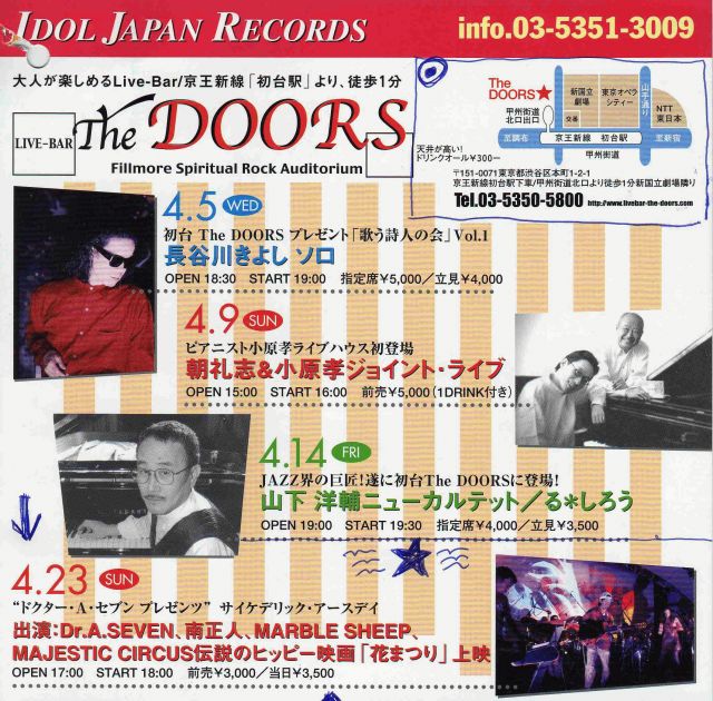 管理人様!告知させて頂きます。 さあ!ナミさん!ファン!は必見! ☆☆《アースデイ特別企画脱線編?》☆☆ ドクター・A・セブン プレゼント! ☆☆『サイケデリック・アースデイ』☆☆ の始まり始まり!! ■4月23日(日) ■PM5時〜会場! サイケデリック・リキッド・ライティング PM6時〜開演!〜PM10時半まで?? ■場所は渋谷区・初台のライブハウス 「The DOORS」にて! ■アクセスは 京王新線「新宿駅」から1駅 「初台駅」下車〜甲州街道北口より徒歩!30秒! http: