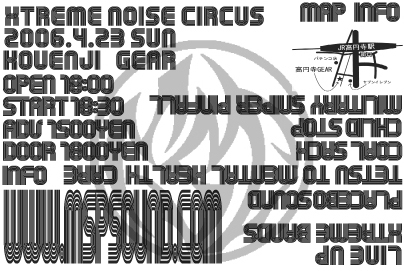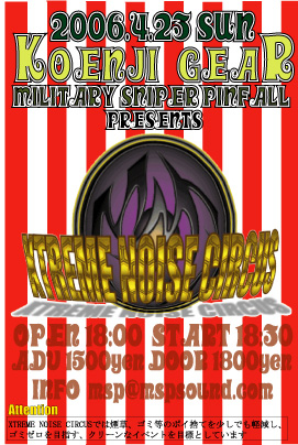 MILITARY SNIPER PINFALL企画 『XTREME NOSIE CIRCUS』第2弾開催決定!! 前回絶大なる反響を残したイベントが また高円寺に帰ってきます!! この機会を見逃すな!! 2006/4/23 高円寺GEAR MSP企画 『XTREME NOISE CIRCUS vol,2』 出演 MSP 鉄とメンタルヘルスケア CHILD STOP PLACEBO SOUND COAL SACK OPEN 18:00 START 18:30 TICKT 1500yen http://www.mspsound.com/ チケットの予約はホームページ mixiでのメッセージ このトピックの参加にて行います!! ご予約はお早めに!!