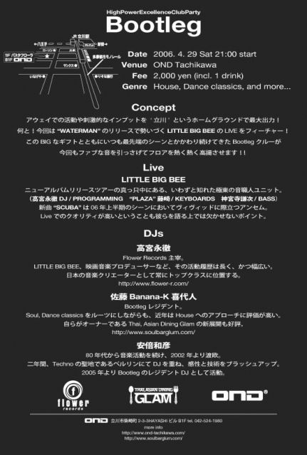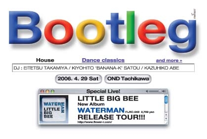 何と!今回は‘WATERMAN’のリリースで勢いづくLITTLE BIG BEEのLIVEをフィーチャー!このBIGなギフトとともにいつも最先端のシーンとかかわり続けてきたBootlegが今回もファブな音を引っさげてフロアを熱く熱く高揚させます!!