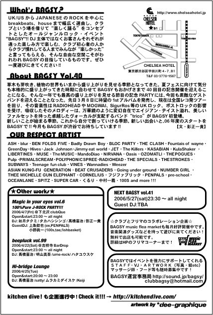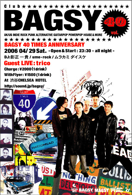 管理人さまいつもお世話になります! UK〜USからjapaneseROCKを中心にオールジャンルで楽しませる、 渋谷のマンスリーロックDJイベント“バグジー”のご案内をさせてください。 Club BAGSY vol.40 -All Genre Rock PARTY- 「40timesAnnivarsary party!!!!」 2006/4/29(Sat) OPEN&START 23:30〜all night DJ's:影正 一貴 / ume-rock / ムラカミ ダイスケ Guest LIVE:trico http://www.trico-music.jp/ Guest DJ:西尾 肇(CHEALSEA HOTEL店長)and more!! @渋谷 CHELSEA HOTEL (Tel)03-3770-1567 Charge :?2000(w/1dri
