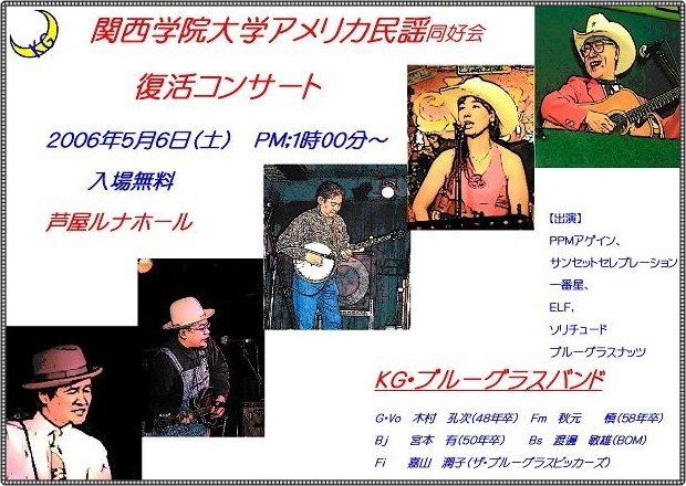 関学アメリカ民謡同好会(現在は消滅してます)のOB会コンサートが30年ぶりに開催されます。 OBOGの皆さんをはじめ現役の学生諸君のご来場をお待ち申し上げます。 ○日程 2006年5月6日(土) ○場所 芦屋ルナホール(芦屋市業平町8−24) 0797−31−4995 ○時間 12時半会場 13時開演 ○出演 1,PPMアゲイン 2,サンセットセレブレーション 3,一番星(PPMスタイル) 4,ELF(Fロック) 5,ソリチュード(S&G) 6,ブルーグラスナッ