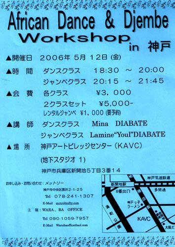 アフリカ帰り初のYOUL神戸クラス、決定です! 皆様のご参加お待ちしております。 *************************************************** 【神戸ジェンベ&ダンスワークショップ】2006. 5 12.(fri) ダンスクラス 18:30-20:00/ジェンベクラス 20:15-21:45 1クラス¥3,000/2クラスセット¥5,000 レンタルジェンベ¥1,000(要予約) 講師:ジェンベ Lamine "YOUL" DIABATE ダンス Mina DIABATE 会場:神戸アートビレッジセンター(KAVC) 地下スタジオ1(神戸市兵庫区新開地5-3-14) お申込み ●メットリー