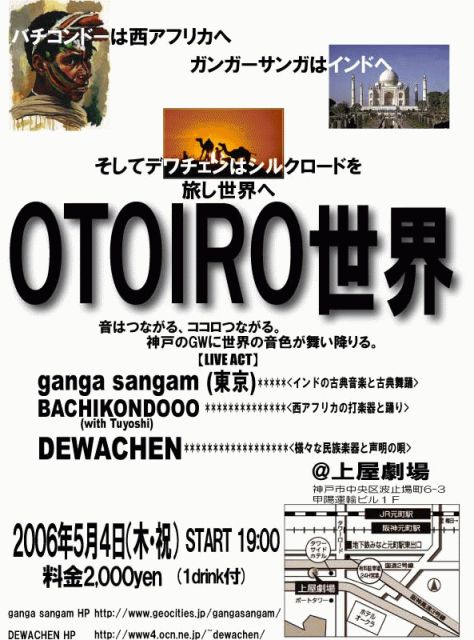 管理人様、皆様、告知させてください。 ********************************************** 世界の民族楽器を奏でる集団「DEWACHEN」。 オリジナルサウンドに声明が溶け合い 異空間を生みだしてくれます。 西アフリカ古典音楽&ダンス 「BACHIKONDOOO」と インド古典音楽&舞踊 「ガンガーサンガ」 の共演。 ************************************************* 【日】5月4日(木・祝) 【時】START 19:00 【屋】上屋劇場(神戸元町) アクセス→http://www.h5.d