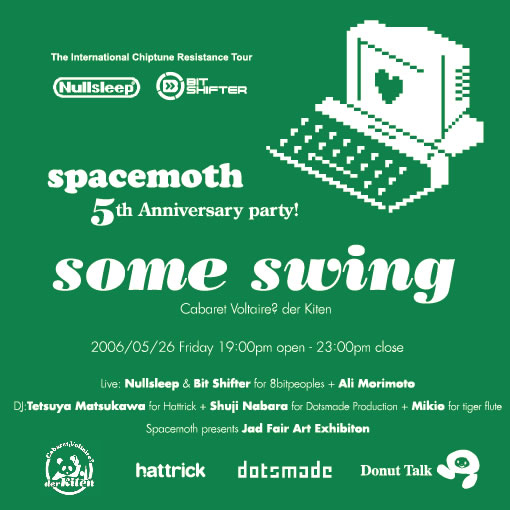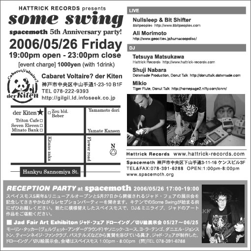 5周年を迎えるSpacemothのりニューアルと記念してイベントを開催いたします。 会場はSpacemothとキテンの2部構成。 ---------------------------------------- Spacemothでは5月26日から始まるジャド・フェア展示会のレセプションも兼ねて。 Spacemoth 5周年記念 & ジャドフェア展示会 レセプションパーティー 2006年5月26日(金) 17:00〜19:00 at Spacemoth(スペイスモス) 神戸市中央区下山手通3-11-16 ケンスビル3F TEL 078-391-6288 http://www.spacemoth.org/ スペイスモス5周年&リニューアルオープンと5月26日から開催されるジ