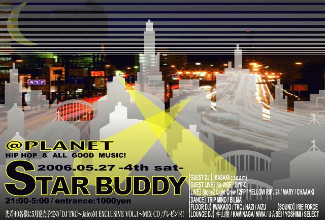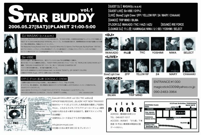 偶数月の「MAGICSTICK」とはまた違うスタイルで 奇数月に新しいイベントが始動します! 「STAR BUDDY@PLANET」〜OPENING PARTY〜 5/27(SAT)21:00-5:00 \1,000 ※先着40名に今月全国発売されるDJ TKCのMIX CDがプレゼント!!!(提供:JacoMusic) GUEST: 【DJ MASAKI(c.r.e.a.m)】 パーティーDJとしてだけではなく、ミックステープDJとしてもその名を知られプロップスを得ている数少ないDJの1人。 日本を代表するラッパー「K DUB SHINE」の音源をほぼ全曲ブレンドミックスで収録した「BEST OF K DUB SHINE(BLENDZ VERSION)」を リ