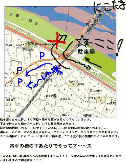 tomoの所属レーベル Vanilla Sky Records社長のヨシケン、アルバム発売前記念イベント!です。 「ヨシケン一派PRESENTS大バーベキュー大会Vol.2!」 5月7日(日)※雨天時決行 場所:神奈川県川崎市多摩川沿いBBQ場 東急田園都市線二子新地駅(二子玉川のひとつ先)から徒歩3分 地図は、上にUPしました〜。 13:00頃から17:00頃までの予定です。 参加費:男性¥2,000 女性¥1,500 学生¥1,000 (学生証をお持ちください) ※参加希望の方はぽちでOKです! tomoのように超方向音痴の