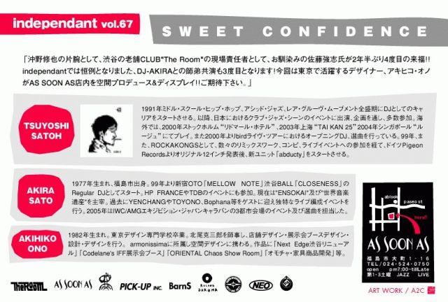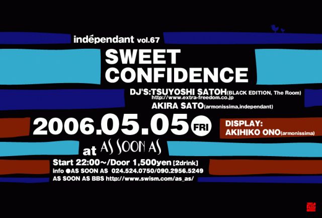 ============================================ independant vol.67 /// SWEET・CONFIDENCE /// 2006.05.05(FRI)at:AS SOON AS(福島市大町) Start 22:00〜 / Door 1.500yen[2drink] DJ'S: TSUYOSHI SATOH(BLACK EDITION、The Room) http://www.extra-freedom.co.jp AKIRA SATO(armonissima、independant) DISPLAY: AKIHIKO ONO(armonissima) 沖野修也の片腕として渋谷老舗クラブ"The Room" の現場責任者として〜お馴染みの佐藤強志氏が 2年半振り4度目の来福!! independant創設メンバーのDJ-AKIRA