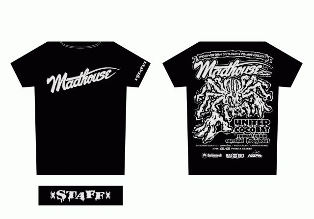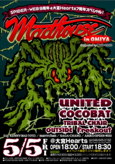 管理人さま 告知失礼します。 5月5日、子供の日にSPIDER-WEB(Action figure online shop) の9周年と大宮ハーツの7周年を記念してAnniversaryイベントを 開催決定!!その名はMADHOUSE in OMIYA 出演バンドにNEWアルバムNINEをリリースし只今、ツアー中のUNITED,そしてNEWアルバムが待ち遠しいCOCOBAT 埼玉代表のエモバンドTRIBAL CHAIR、地元のHARD ROCKバンド OUTSIDE,freakoutが出演します。 そしてDJにGRAPPLEや修斗のT-シャツ等でお馴染みのSAGA-CHANG,そしてUNITEDオリジナルメンバーのMARRR CHAN,ABIKO(SPIDER-WEB)デス!ゲストDJにMAD