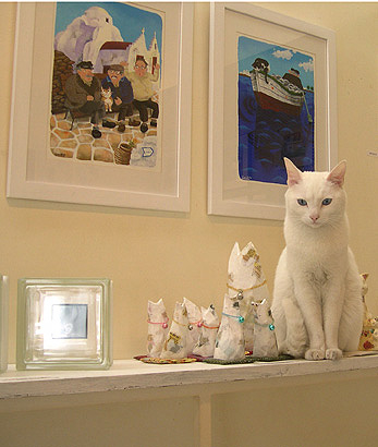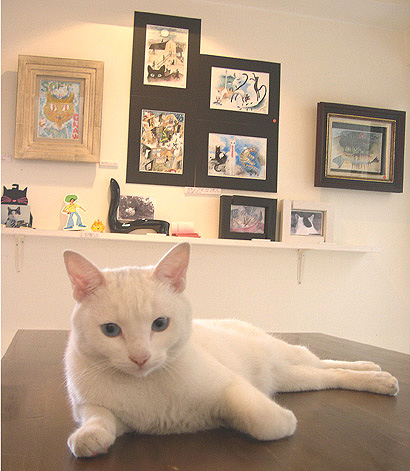 2匹の猫がいるギャラリー・10W gallery恒例の猫好きフェスティバル『猫踏んじゃったなギャラリー』も今年で4回目。 今年は関西を中心に、東京、名古屋他から58名の作家さんが参加し、写真、イラスト、絵画、立体、布モノ、音楽、陶芸・木工・雑貨、小物など、猫をテーマにした様々な作品でギャラリー空間が埋め尽くされます。 『猫踏んじゃったなギャラリー』の楽しさは、参加作家さんやお客様たちとの交流はもちろん、ギャラリーに常駐しているギャラリー猫のクー(白猫)とチチ(三毛猫)と遊んだり、写真を撮ったりと猫好きにはたまらない猫三昧の