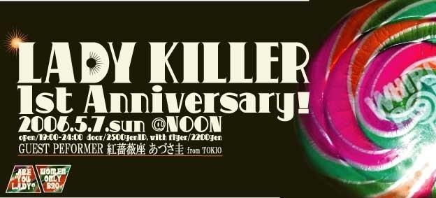 ●●●LADY KILLER●●● レディーキラーは女の子による女の子のためのハッピーパーティ☆ 毎月第一日曜、大阪梅田にて開催中! 二十歳以上の女性なら誰でも楽しんでいただけます。 私たちが提案するのは、その空間から溢れるくらいの最大限のハッピーフレンドリー。 心地よい音楽に身を任せながら、人と人の輪に生まれる素敵な出会いや 予想外の演出に思わず笑顔になる一夜。 ●NEXT PARTY 2006.5.7(日) 〜1st Anniversary!〜 2006年5月、レディキラーは一周年を迎えます!みんなみんな、レディキラーを愛して