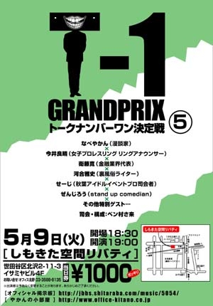 明日、T-1が開催されます。 T-1はいろんな職種の方の ライブでしか聞けないようなお話がたくさん聞ける おもしろいトークライブです。 前回のT-1は 不思議なテンションで異様な雰囲気になっておりましたが 今回もどんなお話がきけるか楽しみです〜。 T-1 GRANDPRIX =トークナンバーワン決定戦5= 日 時:5月9日(火) 開場:18時30分 開演:19時 会 場:しもきた空間リバティ TEL.03-3413-8420 (東京都世田谷区北沢2-11-3 イサミヤビル4F) 料 金:1,000円[当日券のみ] 出 演:なべやかん(漫談
