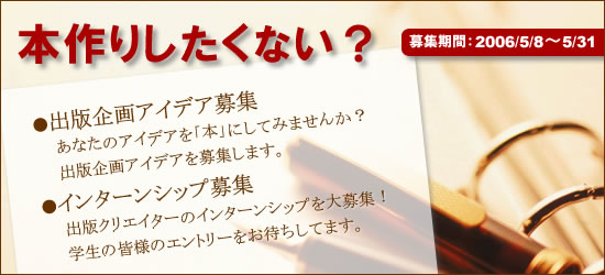 トクモニではインターンシップを大募集しています(*^-^)ノ http://www.tokumoni.com/fr.php?f=tora_ana 【出版クリエイター大募集】キミのチカラで本を作る! 〜 学生のみんな、集まれ! 〜 ───────────────────────────── <募集期間> 2006年5月8日(月)〜5月31日(水) <募集分野・内容> 1.編集ライター 本の制作における編集業務を担当します。クライアントとの 打ち合わせから参加し、進行管理や原稿の執筆、リライト・ 校正、原稿整理などの編集業務全般を