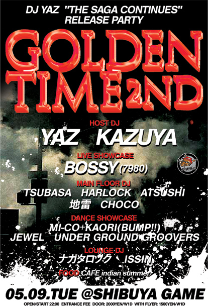 GOLDEN TIME 2ND "DJ YAZ/THE SAGA CONTINUES"RELEASE PARTY 5月9日(火)22:00- 場所:渋谷GAME 料金:Door2000円 1ドリンク、W/F1500円 1ドリンク ※下記のURLのページを提示すればW/F料金で招待いたします。 http://www5b.biglobe.ne.jp/~hip-hop/i/goldentime2nd.html 2000年より5年間に渡り六本木NUTSをはじめ渋谷VUENOS、そしてSIMOONと開催されてきたGOLDEN TIMEが毎月第一火曜日に渋谷GAMEにてメンバーもあらたに再始動!! ホストDJをつとめるYAZ、KAZUYAをはじめとしたDJ陣によるHIPHOPを軸に新旧織りまぜた幅広い選曲