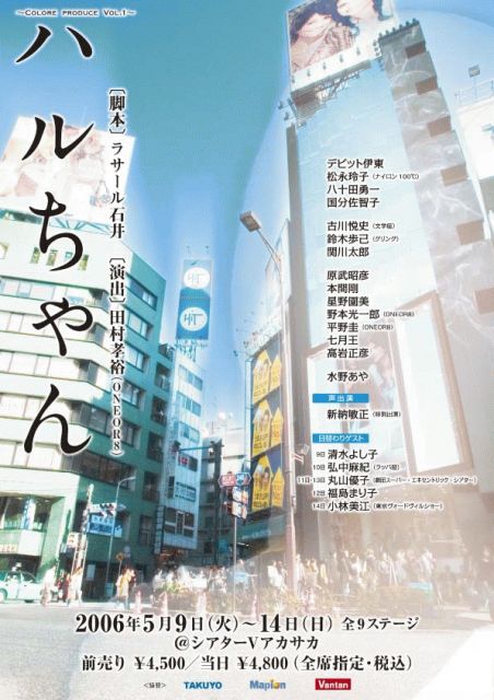 岐阜県人の芸能プロデューサー上野真香人さんによる、初舞台「ハルちゃん」が上演されます。 かのラサール石井さんの脚本また、演出はポストクドカン(工藤官九郎)と雑誌にも取り上げられている期待の若手だそうです。見て損はさせませんと上野さんの弁です。 開催は連休明けの5月9日〜14日までの昼夜全9ステージだそうです。劇場はシアターVアカサカ TEL 03-3583-6040 港区赤坂2-16-9(地図) 興味のある方は、全席指定なので予約を忘れずに。 予約は下記から。 劇場 シアターVアカサカ TEL 03-3583-6040 港区赤坂2-16-9(地図)