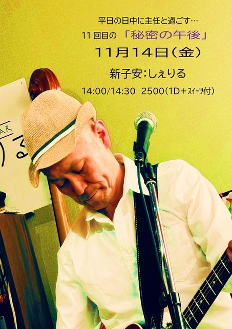 ●概要 11月14日(金) 新子安:しぇりる https://sherylcafe.jimdofree.com/ 平日の日中に主任と過ごす… 11回目の「秘密の午後」 14:00/14:30 16:00終演予定 2,500円(1D+スイーツ付) ●内容 なんと!平日の日中のライブ! 来れる人いるのか?(^^;) これが意外にも過去10回ともそれなりに… そこのマダム!どうですか? 私との熱い時間を過ごした後、何食わぬ顔でおうちにお帰り下さい(笑)。 勿論、マダムじゃなくても男性でもウエルカムですよ♪