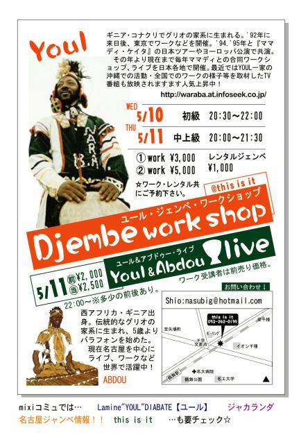 【Lamine "YOUL" DIABATE(ラミン“ユール”ジャバテ】 2日間のジェンベワークショップ&ライブ! 名古屋で久々にYOULのワークショップとライブが開催されます! 今回のライブは同じギニア出身のAbdou Bangouraと共に! ジェンベだけでなく、バラフォンなどいろんな楽器が 楽しめそうです! @this is it(tel: 052-262-0139) ★ワークショップ★ 10(水)20:30 - 22:00 初級クラス 11(木)20:00 - 21:30 中上級クラス 1クラス¥3,000/2クラスセット¥5,000 レンタルジェンベ¥1,000 (ワークシ